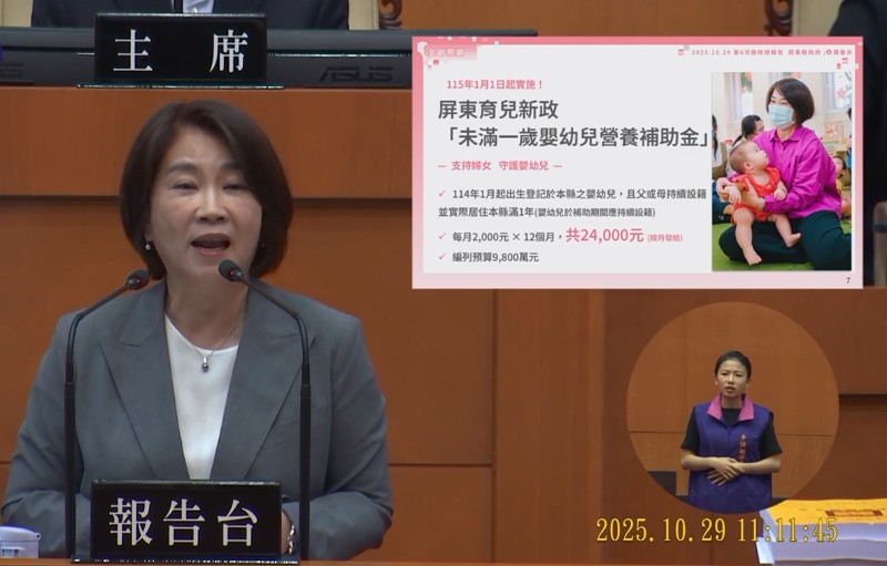 屏東縣長周春米今(29)日於縣議會第20屆第6次定期會提出施政總報告,宣示推動「全齡照顧、城市進化、產業升級、文化觀光、屏東韌性」五大策略,並宣布自115年1月起實施「未滿一歲嬰幼兒營養補助金」,每名嬰幼兒最高可領2萬4000元。