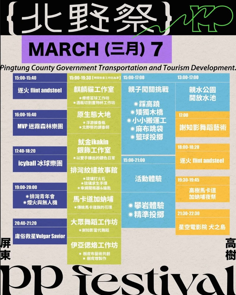 邁入第三屆的「2026 屏東北野祭 PP Festival」將於3月6日到8日在高樹鄉新豐親水公園旁登場,每天下午3點到晚間9點免費入場,從車宿露營、現場音樂、風格市集,到親子活動一次打包,讓大家實際走進屏北山野,體驗戶外生活的節奏。