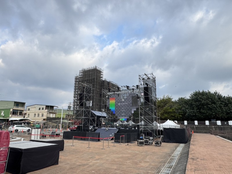 屏東枋寮漁港情人節演唱會明晚登場,現場大型戶外舞台、燈光塔與巨型LED螢幕都已就位,中央還設計成醒目的愛心造型舞台視覺,讓現場氣氛浪漫升溫,預計明日晚間將湧入大批人潮。
