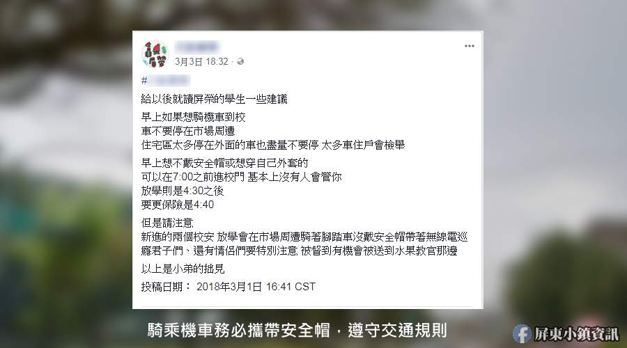 內容全文如下:「給以後就讀屏榮的學生一些建議,早上如果想騎機車到校,車不要停在市場周遭,住宅區太多停在外面的車也盡量不要停 太多車住戶會檢舉。早上想不戴安全帽或想穿自己外套的,可以在7:00之前進校門,基本上沒有人會管你,放學則是4:30之後,要更保險是4:40,但是請注意,新進的兩個校安,放學會在市場周遭騎著腳踏車沒戴安全帽帶著無線電巡癮君子們、還有情侶們要特別注意,被督到有機會被送到水果教官那邊,以上是小弟的拙見。」