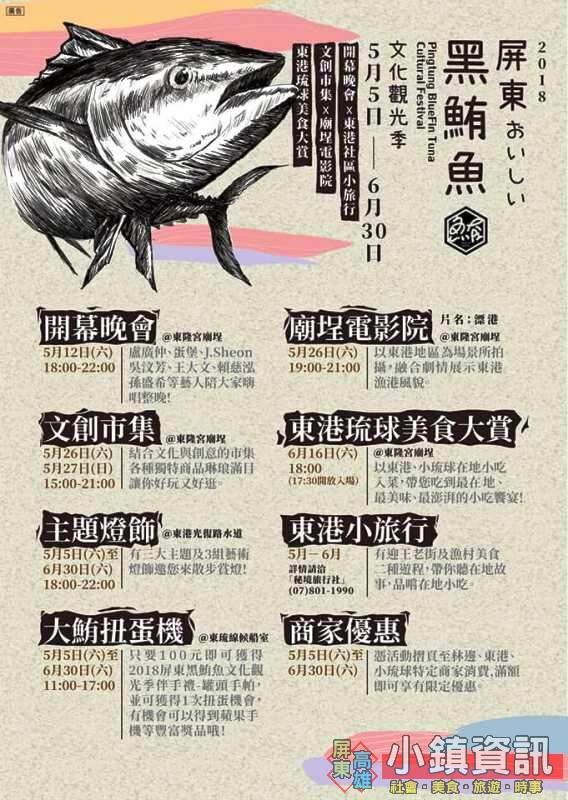 為期2個月的2017屏東黑鮪魚文化觀光季正式開跑,從5/5(六)起 東港琉球美食大賞活動開放報名;5/12(六)在東港“東隆宮廟埕前”舉辦開幕晚會,將邀請音樂鬼才盧廣仲擔任壓軸演出以及饒舌詩人蛋堡、全能唱作新人王J.Sheon、文青唱將吳汶芳、王大文、賴慈泓、孫盛希等超強卡司熱情開唱;5/26(六)東港東隆宮廟埕前,將播放《漂港》電影口碑場,本部影片以東港地區為場景拍攝,融合劇情、展示東港漁港風情,邀請民眾看見東港特有漁村的風土人情,並回溫廟埕前觀賞電影的趣味。5/26、27(週末)還有文創市集,包含漁創、選物、輕食等攤位,及寓教於樂的小學堂活動,提供參加民眾手作慢活的樂趣。