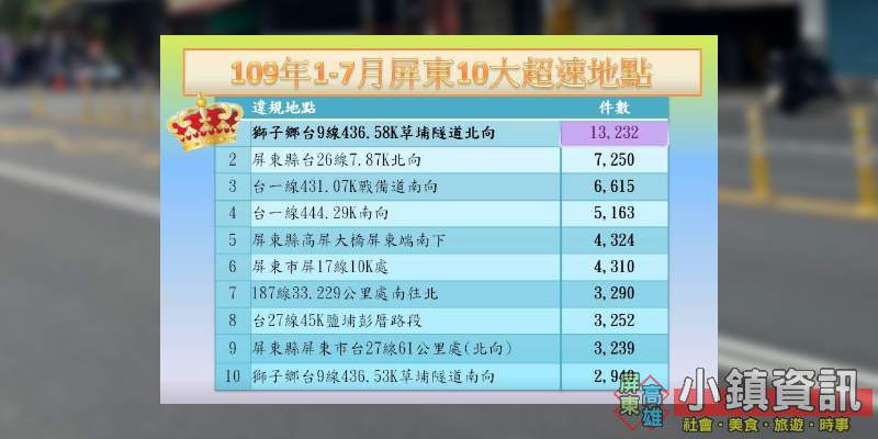 屏東十大超速地點依開罰數順序為,獅子鄉台9線436.58K草埔隧道北向、屏東縣台26線7.87K北向、台一線431.07K戰備跑道南向、台一線444.29K南向、高屏大橋屏東端南下、屏東市屏17線10K處、187線33.229公里處南往北、台27線45K鹽埔彭厝路段、屏東市台27線61公里處(北向)、獅子鄉台9線436.53K草埔隧道南向。