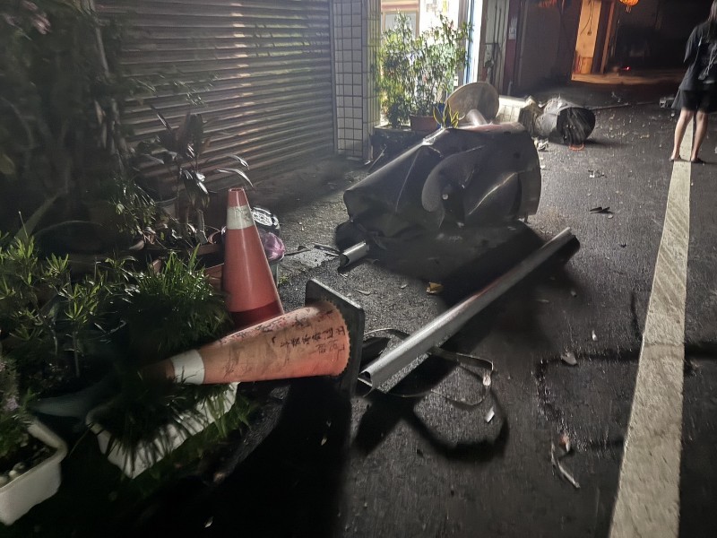 從讀者拍到的照片可以看到,民宅前的鋼棚整片塌下來,一輛轎車車頭嚴重受損,地上滿是碎裂的玻璃和零件,拖板車的車頭也被撞到變形,街道一片狼藉。