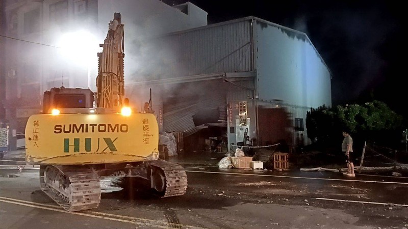從現場照片可見,消防人員以破壞器材切割鐵捲門進入火場,同時動用大型挖土機協助破壞側門與外牆,爭取灌救時效,畫面中可見倉庫多處受損,有大量紙箱與貨物堆置於門前。