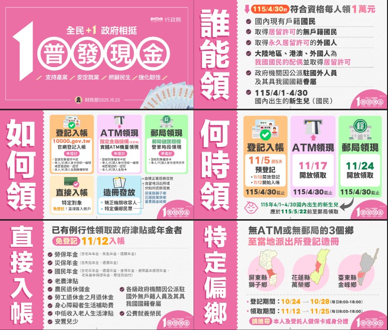 財政部指出,「全民+1 政府相挺」官方網站(https://10000.gov.tw)已於23日晚間8時上線,內容包括領取資格、方式說明、法規專區、防詐騙資訊及捐款管道等。預計自11月5日起開放五天預登記,11月10日開放正式登記;ATM領現及郵局臨櫃領現分別於11月17日與11月24日展開。