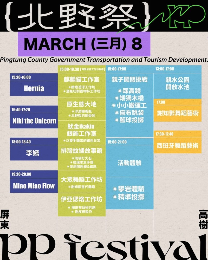 邁入第三屆的「2026 屏東北野祭 PP Festival」將於3月6日到8日在高樹鄉新豐親水公園旁登場,每天下午3點到晚間9點免費入場,從車宿露營、現場音樂、風格市集,到親子活動一次打包,讓大家實際走進屏北山野,體驗戶外生活的節奏。