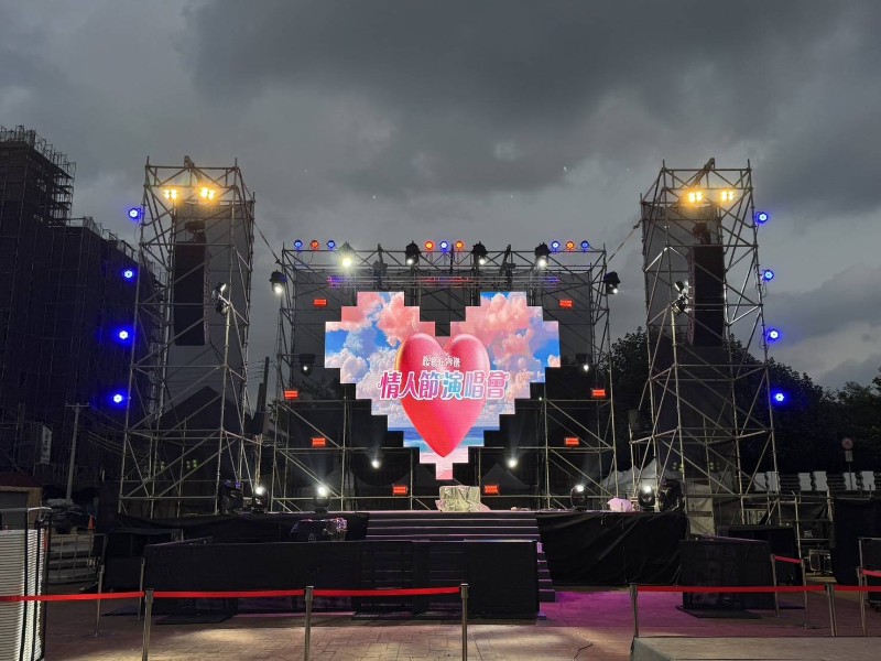 屏東枋寮漁港情人節演唱會明晚登場,現場大型戶外舞台、燈光塔與巨型LED螢幕都已就位,中央還設計成醒目的愛心造型舞台視覺,讓現場氣氛浪漫升溫,預計明日晚間將湧入大批人潮。