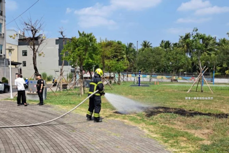 屏東市豐連街瑞光公園今(25)日中午發生一起火警,45歲莊姓男子在公園草地焚燒動物屍體,導致草皮被燒出一大片焦黑痕跡,警防抵達後先灑水處理,後續將依《社會秩序維護法》移請裁罰。